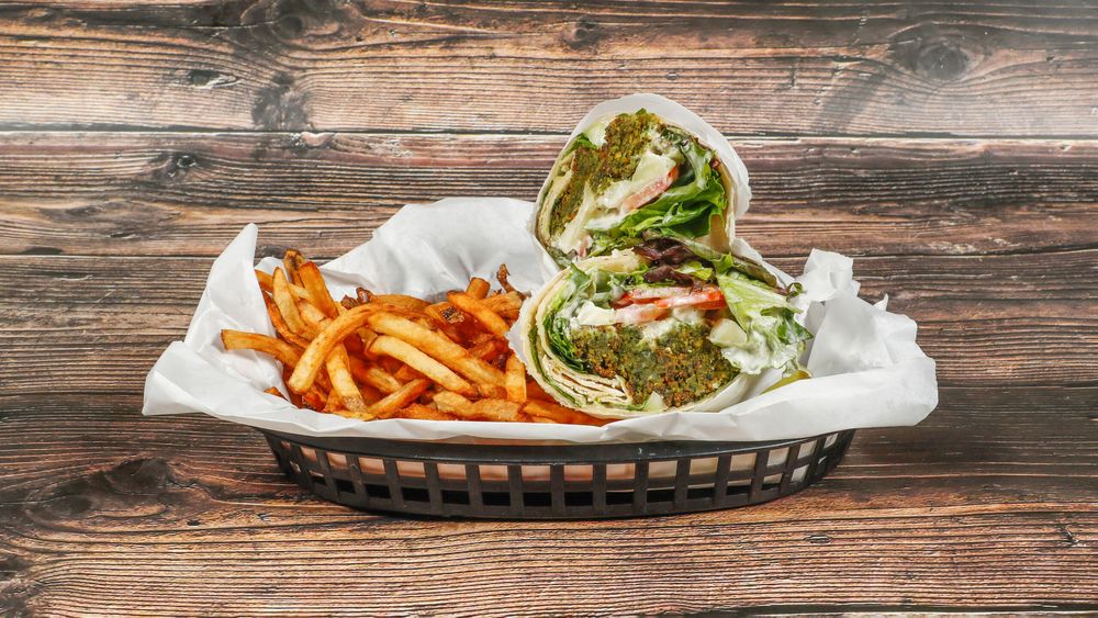 3 Eggs, Spinach, Onion, Garlic, Parsley, Tots, Feta and Ricotta Cheese in a 14" Flour Tortilla