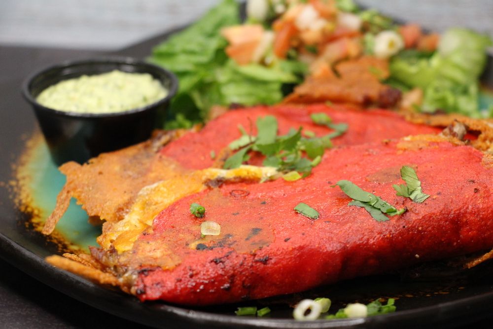 3 Eggs, Tots, Tri - Tip, Guacamole, Pico, Cheese, Black Beans, Chimichurri Sauce, and Chipotle Cream Sauce in a 14" Flour Tortilla